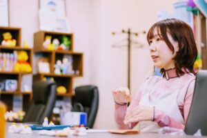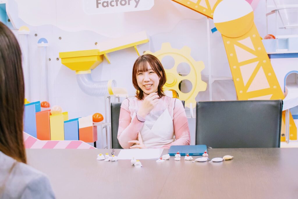 社員の多くがアニメやキャラクター、かわいいものが好きで、日常会話でも「今日の服かわいいね」や「このアニメ見た?」など、フランクなやり取りが多いです。友達のような感覚で接する人が多く、安心して働ける職場です。